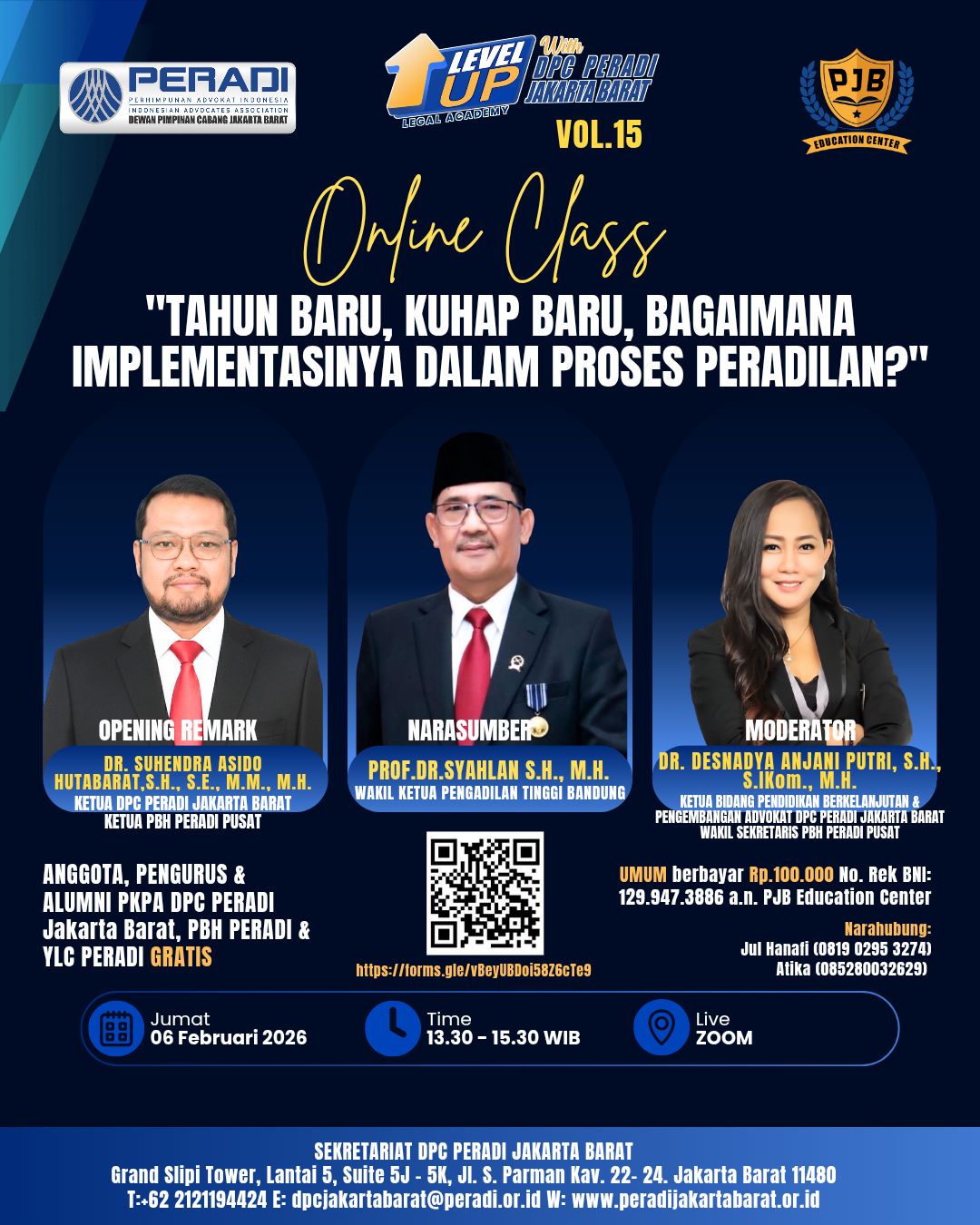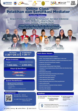 Diberitahukan kepada Bapak/Ibu, akan dilaksanakan Online Class Pelatihan dan Sertifikasi Mediator (Certified Mediator) hasil kerja sama DPC PERADI Jakarta Barat dengan Justitia Training Center.